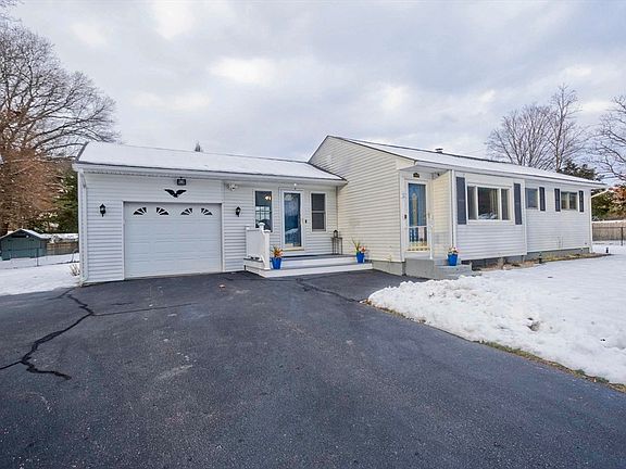 Discover this charming ranch on a beautiful corner lot, fully fenced in with a gated entrance! This property features a one-car garage and two sheds for all your storage needs—one with electricity! Inside, you'll find an open floor plan with a dining area boasting gleaming hardwood floors, an electric fireplace, and exterior access to the front and back decks, as well as the garage. The kitchen features all brand new stainless steel appliances, tile flooring, and looks out to the expansive backyard. The spacious living room includes an entry closet and hardwood floors under the carpets (APO). Down the hallway are three bedrooms, all with hardwood floors, and a full bathroom with tile flooring. The basement offers ample space for storage, hobbies, or a workshop. The laundry area includes a new dryer as of 2025 and a new washer as of 2021! Enjoy single-level living in a conveniently located home with a fully fenced in lot! A perfect blend of comfort and practicality!