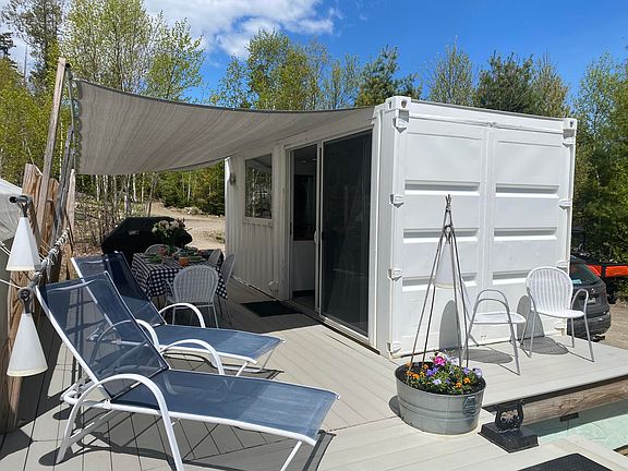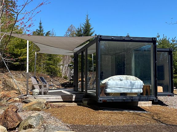 More than glamping, this creative home base camp can be your weekend getaway, your all summer long hideaway, your year-round home, or your temporary home while you build something special on this spectacular 47-acres. Located just a 10-minute drive from downtown Camden, this property comes with 300 ft. of road access off Rt 1. This site includes a wonderful firepit gathering space, three large tent platforms and a 4,200 ft. road to the top. Beyond this property is the Camden Hills State Park and below are expansive views of Penobscot Bay. The two container structures are each 146.5 sq. ft, and the large bedroom tent is 18 ft. x 23 ft. and includes a bathroom with shower. Plus, a dreamy outdoor shower with sink. The kitchen is fully equipped and includes a washer and dryer. All structures have heat pumps for cooling and warming and are surrounded by composite decks for easy clean up and care. The property has a formal 2-bedroom septic system and drilled well. So many ideas, options, and opportunities with this unique offering. Notice required for all showings; sellers live on property.