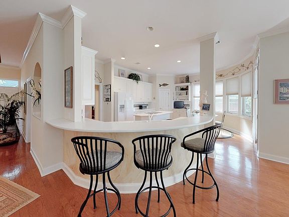 *REDUCED! Custom built 1 level 3 bedrm plus Office with french doors & built-ins, 2 1/2 bath hardcoat stucco home! Fabulous, light & cheery layout overlooking the 5th green! New HVAC! Beautiful wood floors! Foyer with tray ceiling & decorative niche! Living rm with gas fireplace, built ins for storage & wet bar! Huge kitchen with fantastic curved breakfast bar, island, built in microwave, trash compactor, refrigerator stays, roll out shelving, built in space for cookbooks, pantry & breakfast rm opens up wonderfully to living rm! Dining rm with beautiful columns! Split bedrm plan! Archway to owners suite with sitting area, access to deck, 2 walk in closets with built ins, double sink vanity, jetted tub, amazing roll in tile shower, tile floor & water closet! Spacious spare bedrms with fans! Spare bath with tile surround in shower/tub & floor! Laundry rm with utility sink, tile floor, storage cabinets & washer dryer can stay! Garage with space for workbench plus utility closet!