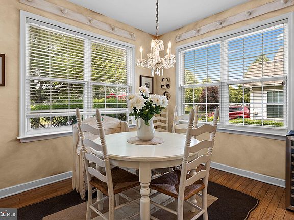 This is the Flowers Mill property you've been waiting for! Updated, upgraded and on a premium lot! As you pull up to the twin home in the highly sought after Villages of Flowers Mill 55+ Community, you will be immediately struck by beautiful landscaping in front that wraps around the house and it's spectacular rear view. Upon entering through the covered front patio, your eyes will be drawn to the hardwood floors and high ceilings, both of which flow throughout the house. The beautiful eat-in kitchen features modern, white 42" cabinets, granite countertops, stainless steal appliances, an island for additional seating, storage and counterspace AND plenty of natural light! Also note the custom, hand-painted walls that add to the elegant feel of the space. Off the kitchen you will find a combination living room / dining room with gas fireplace, wainscoting and vaulted ceilings. A bonus sunroom sits off the back of the house that leads to a beautiful paver patio and large tree-lined lot that makes this house truly standout from the rest. Also to be found on the main floor is the primary bedroom with en-suite, and 3 closets! A nicely sized walk-in closet, and additional clothing closet as well as a linen closet. Finishing out the first floor is the laundry, conveniently located near the main bedroom, a powder room and access to the 1-car garage. Upstairs you will find the second bedroom with it's own full bath, perfect for an office or guest room and big enough for both as well as a large storage closet and utility room which offers more additional storage space.