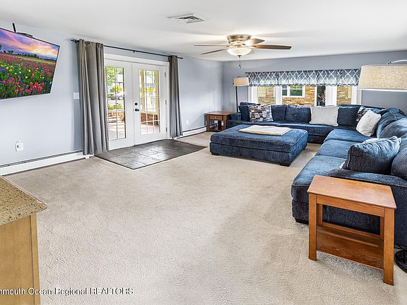 step down and you are in the great room with a bow window, backyard view and French Doors adjoining