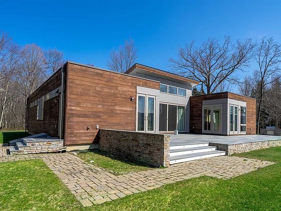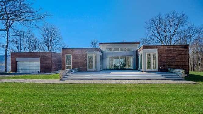MESMERIZING VIEWS Walls of glass doors access the magnificent serenity and magic of every season; the ultimate house for indoor-outdoor living.Three bedroom, three bath, eat-in-kitchen, dining, sumptuous living room, with library/den, laundry room and two car garage. A team of leading Architects have combined warm eco-friendly materials, clean and spacious lines, high ceilings and thoughtful systems to create delightful sun drenched indoor spaces. Glass walled Living areas with 15' vaulted ceiling and fireplace, a perfect space for entertaining, or just relaxing, surrounded by captivating views. Wood floors and radiant floors throughout living spaces and bedrooms with glass, marble and stone bathrooms. Gracious stone patios and an outdoor kitchen make this the perfect escape from city stress the only sound are the wind through the mature tress and singing birds. Perfect location to enjoy and experience the best of the Hudson Valley