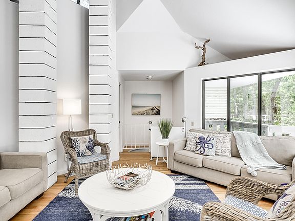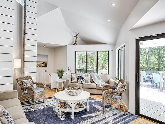 This contemporary retreat, designed by Alan Dodge, is nestled in a private, wooded setting near Drummer Cove! The living area features soaring vaulted ceilings, large windows, and a slider which opens to the balcony that stretches out into the trees. There you'll enjoy summer breezes while communing with the birds! Experience life in a tree house year-round where you can simultaneously enjoy nature and the comfort of central AC (2019)/forced air heat regardless of the weather. Seasonal peeks of the water too! Completely renovated including windows (2017-18). The home offers 2 levels of living space--the living room, kitchen, 2 bedrooms, and a full bath are located on the 1st floor. On the lower level is a family room with a wood-burning stove, 2 bonus rooms, a 2nd full bath with a walk-in shower, and laundry. This unique home is a serene slice of heaven convenient to Paine Hollow and Pleasant Point Landings where you can swim and paddle out to Wellfleet Harbor! Or take the trail around Drummer Cove and savor the glow of the rising or setting sun at the water's edge! Great rental history. Buyers/agents to confirm details.