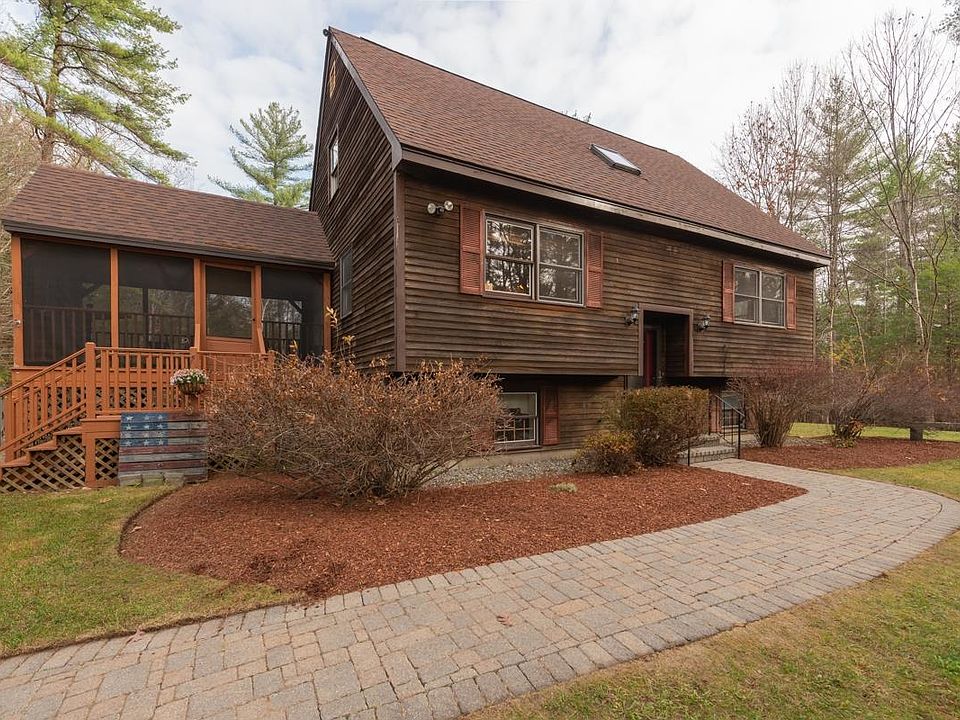Set back off the road and wrapped in a wooded treeline for added privacy awaits this beautifully maintained Cape/Split on over 5 acres. A blend of hardwood floors and tile cover the main level offering a spacious front to back Living Room, Full Bath, versatile space that could easily accommodate and be used as a Dining Room or Family Room, and eat-in Kitchen boasting Maple cabinets and a center island with seating leading to an almost 200 sq ft 3-season screened in porch overlooking the yard – perfect to enjoy nature, morning cup of coffee and space to entertain! Upper level offers a Full Bath and 3 Bedrooms. Downstairs to the basement find a great bonus space with a pellet stove to keep warm during those cool fall nights and New England winters. Basement also offers an unfinished area for laundry and storage or space to finish and add in an additional bonus room if desired. Get out and enjoy the weather year road with hiking and snowmobile trails close by! Located between Rt 101 and the MA/NH line places this home in a great commuter location while enjoying the privacy of nature. Don’t miss out on this property!