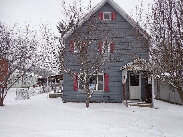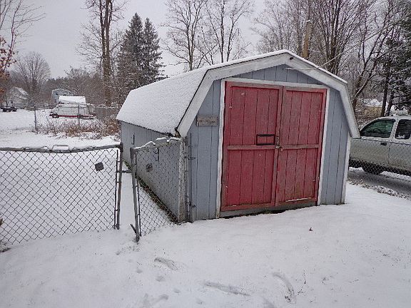 Exterior Features:Aluminum and vinyl siding with an asphalt roof. Some of the siding in the rear of the house is damaged. Fenced in back yard. Small storage shed. Interior Features:Interior is in overall fair to poor condition. Mostly vinyl flooring throughout which is damaged in many places. Drop ceilings throughout as well. Kitchen is complete with a gas range and vinyl floor. Small room off of the kitchen contains laundry hook ups and the hot water tank. Bedrooms are on the second floor and have carpeted floors and paneled walls.