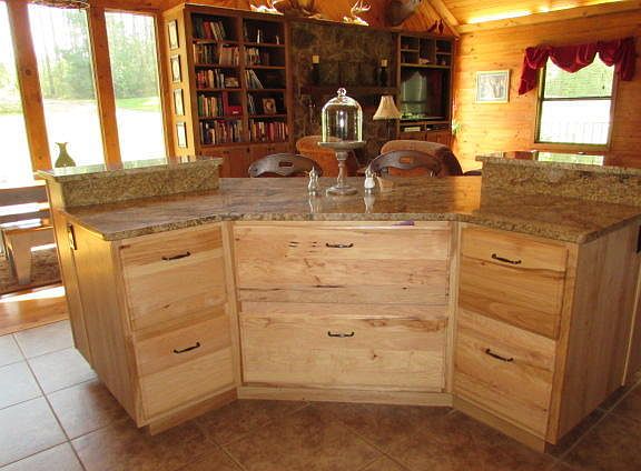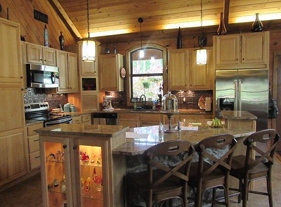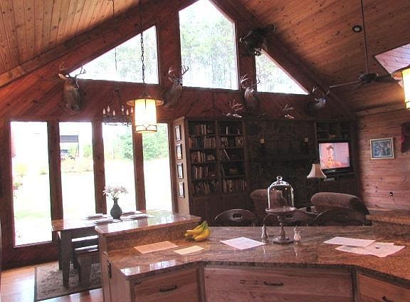 Private and Beautiful Rustic Style Home ! This 3 Bedroom 2 1/2 bath home has rustic charm ! Enjoy a large open plan den/dining/kitchen with cathedral ceiling and stone gas log fireplace. Kitchen has custom cabinets with granite countertops. Beautiful pine floors. Large Master with built in cabinets and bed. Master bath with double ceramic shower and jetted tub. Half bath down stairs.