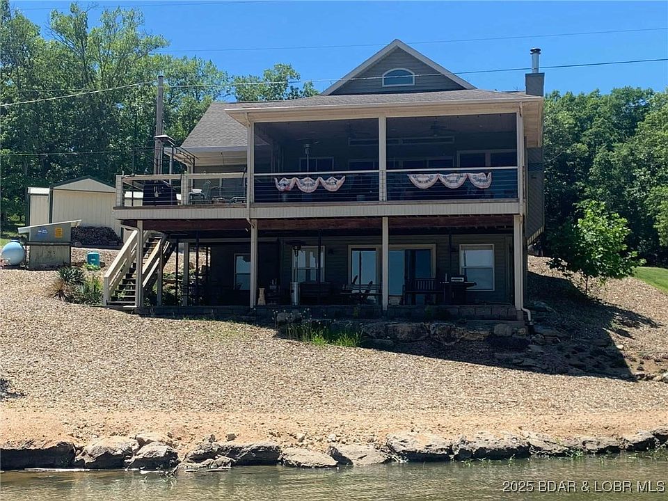 ENDLESS POSSIBILITIES- complete living on each level, great for vacation rentals or multi-generational living.Lakefront retreat on nearly 2 acres with approx. 250' of shoreline! This 4BR, 3.5BA home features hardwood floors, vaulted ceilings, hickory cabinets, granite counters, and stainless appliances. The upper level opens to a screened-in porch with beautiful lake views—perfect for relaxing or entertaining. The primary bedroom offers private access to an open porch where you can enjoy peaceful lake views and morning coffee. The lower level includes a full 2BR, 2BA living space with an open-concept kitchen—great for guests or vacation rental. A 3,040 sq. ft. workshop offers AC/heat, 100-amp panel (200-capable), and space for lake toys, vehicles, and more. Includes a 12x24 storage building, RV pad, and two-well dock with 2 wave runner pads.