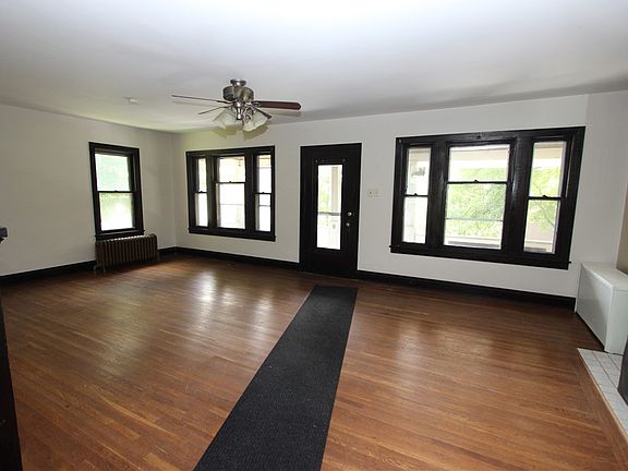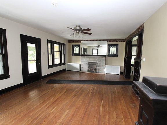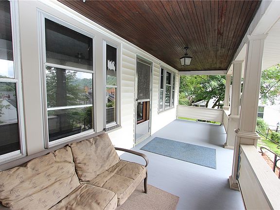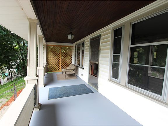 Enjoy the view from the covered front porch. Huge living room with hardwood flooring and plenty of windows. Dining room also has hardwood flooring and original wood built ins. New kitchen cabinets, countertops, tile flooring, range hood, and dishwasher. 3 charming bedrooms on the upper level as well as remodeled full bathroom. Open basement with workbench, additional shower, toilet, and additional storage rooms. Home has new electrical service line and panel box. Oversized 1 car detached garage.
