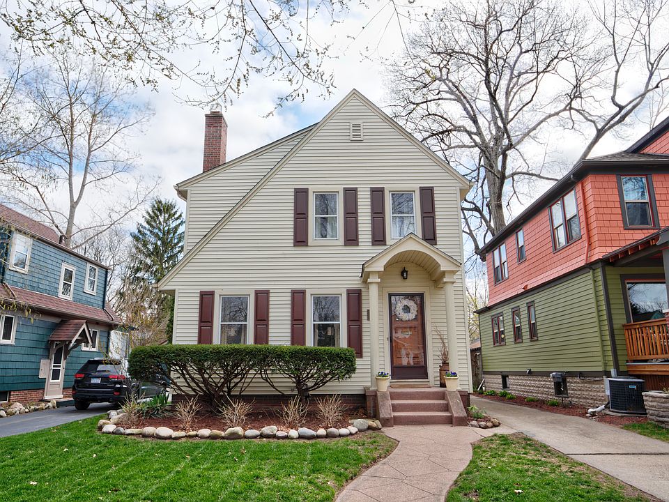 Wonderfully restored colonial home with leaded glass windows, hardwood floors, beautiful vintage kitchen, and brick fireplace. Living room entry glows with natural light from the windows. Small details like the wood framed windows, brick fireplace, coved ceilings, and copper air duct covers make the living areas feel warm and comfortable. Dining room connects living room and kitchen for an open and functional layout. The kitchen is stylish with vintage restored counter and cabinets. Upstairs three spacious bedrooms share a full bath. Built-in cabinets and shelves in bedrooms and hallway. The backyard boasts vibrant healthy green grass, back patio and detached two car garage. Welcome Home!