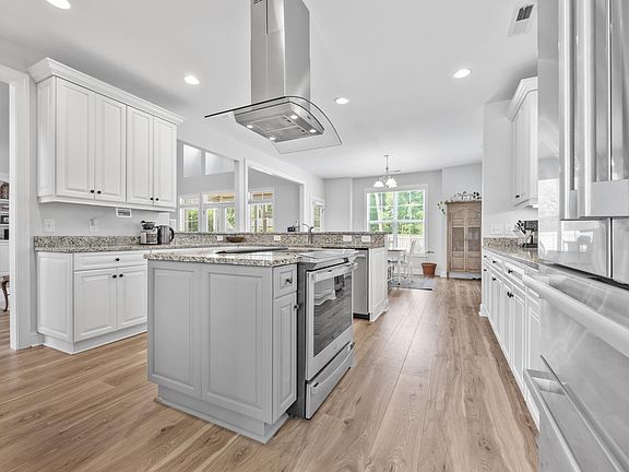 - Fireplace, Window Treatments, Breakfast Bar, Breakfast Area, Kitchen Island, Stainless Steel Appliances, Solid Surface Counters