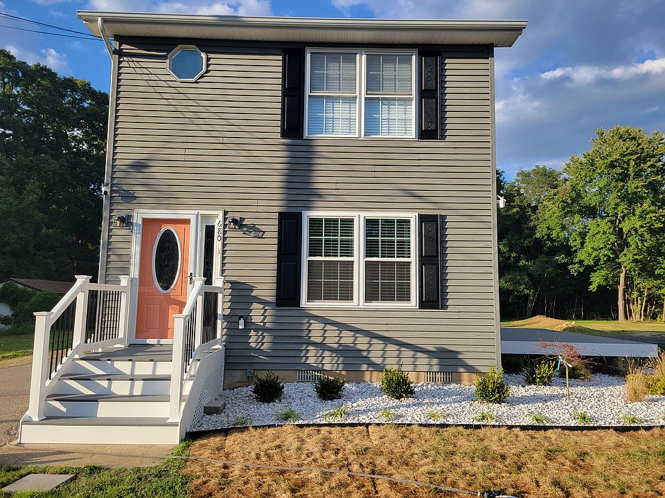 Step outside to enjoy the oversized Trex deck, surrounded by fresh landscaping and overlooking a wooded backdrop perfect for entertaining or relaxing. The home offers two large wrap-around driveways, providing ample parking and space for boats, RVs, or multiple vehicles.