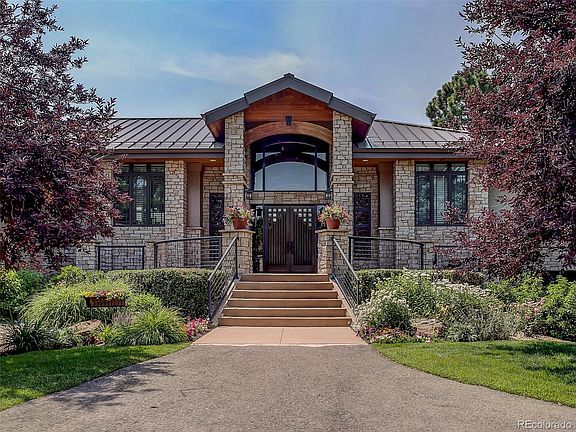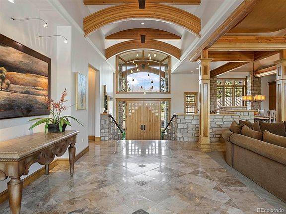 Welcome to this incredibly beautiful Colorado Contemporary Masterpiece. Nestled among soaring pines on a pastoral 1.46 acre site, the home was specifically designed to bring the outdoors in, with lovely entertainment areas that showcase a serene setting. The property features an open concept floor plan, extensive beam work, custom wood columns, modern design elements, intricate stonework and crisp paint hues. Architectural details include 14' ceilings with acoustic maple wood accents and an abundance of windows which flood the home in natural light. The kitchen offers an exceptional level of quality both in finish detail and design. Featuring slab granite countertops, custom mahogany cabinetry and top of the line stainless steel appliances including a Wolf six burner gas range, Wolf convection oven, Dacor warming drawer, two Asko dishwashers, microwave, Sub-zero refrigerator, wine cooler and two beverage drawers. A spectacular birch wood barrel ceiling showcases the center island which is perfectly suited for entertaining. This property features two staircases, with an elevator for access to the lower level and garage. The Primary Suite offers a sitting area with mountain views, large wood and onyx accented fireplace and a vaulted ceiling with exposed beam work. The lower level includes 3 bedroom suites, study, wet bar w/billiards area, family room, laundry room and storage. The crowning glory is the architecturally significant pool house complete with massive cedar beam work, indoor pool, fitness room, fireplace surrounded by floor to ceiling windows and doors which bring the outdoors in. A 4 car garage with room for golf cart or 5th car, storage room and workspace. Enjoy over 4000sq ft of patio and deck space w/snow melt system on upper deck and front patio, a garden w/shed and raised beds, volleyball court and horseshoe pit. Front Range Road is a wonderful neighborhood with tree lined streets, pastoral lots and a lifestyle that offers the charm of days gone by.