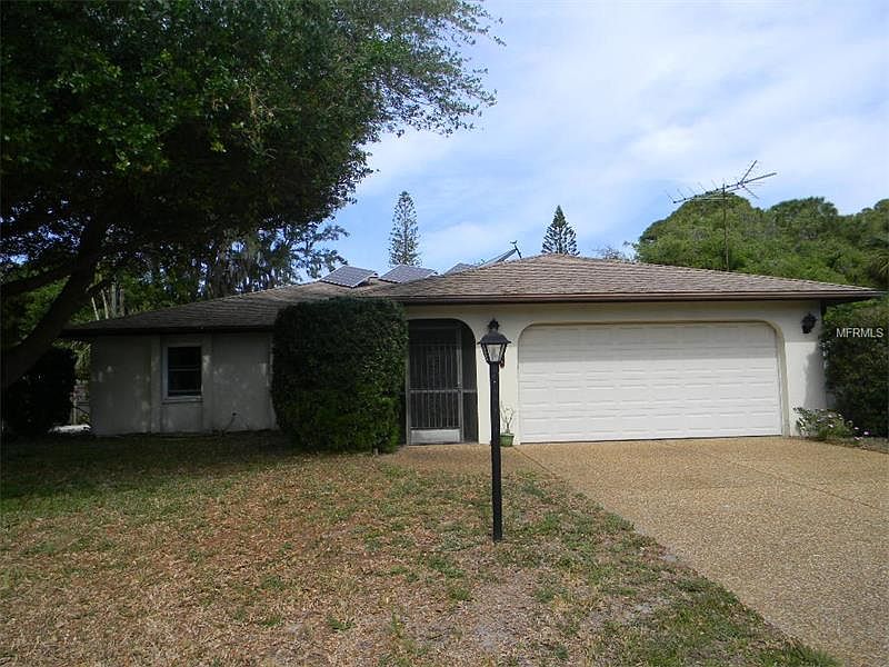 Don't wait! You seldom find a pool home for under $200,000. This home has a bright open floorplan with a split bedroom situation, great for guests. The kitchen is the focal point and a cook's delight with lots of cabinets, and island breakfast bar, new dishwasher, and a pass through window to the lanai/pool area. The master bedroom is generous size and features a walk-in closet and separate vanity and shower area. There is also a door out to the pool. On the other side of the house is the inside laundry room and guest bedroom which is also a good size. Outside you'll find a sparkling pool and caged lanai with a peaceful fountain in the corner. There is plenty of privacy with nice vegetation plus banana and mango trees. There's also a storage shed with plenty of room for the handyman of the house. Another great feature is a 2 car garage plus and extra parking pad for boat or RV. The outside of the home has been painted with a lifetime guarantee and all the windows have been replaced, even the slider from the dining area to the lanai. The pool is heated with either solar or electric heat. Guess what??? NO FLOOD INSURANCE need here. You can join the South Venice Civic Association if you wish, you can also purchase a key to the community boat ramp and a pass for the ferry that carries you to a private beach that only members can use. It's all for a very nominal fee too! Don't let this one pass you by!