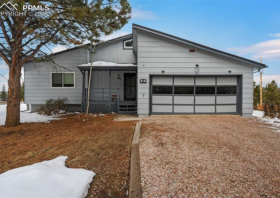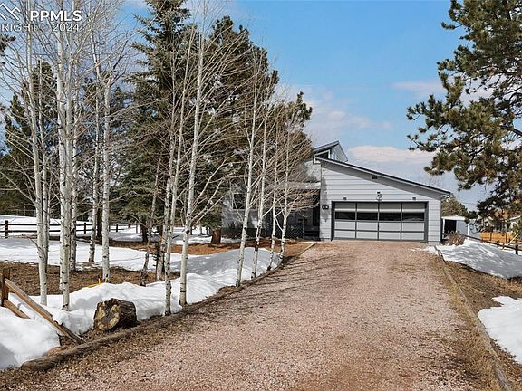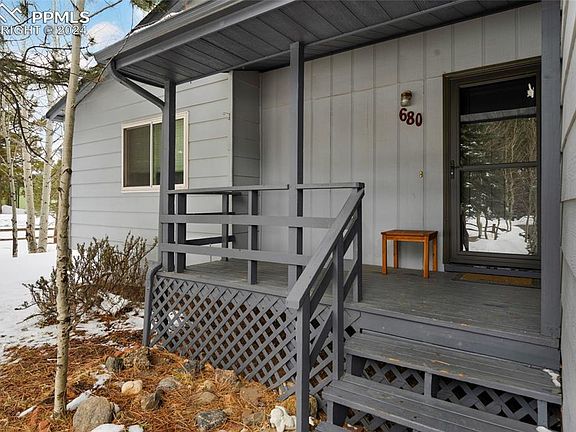Welcome to this charming Woodland Park gem, a move-in-ready retreat nestled in a quiet community offering access to numerous hiking trails for outdoor enthusiasts. This property presents a rare opportunity for those seeking tranquility combined with convenience. As you approach, you'll be greeted by the serenity of mature aspen and pine trees, framing the home and creating a serene ambiance. A split-rail fence adds to the rustic charm, while the long driveway leads to a sizable lot, offering ample space and privacy. Step inside to discover a well-designed interior with a functional layout ideal for everyday living and entertaining. The newer luxurious vinyl plank floors provide both elegance and easy maintenance, extending throughout the home. Fresh interior paint adds a touch of modernity while enhancing the bright and airy atmosphere. The main level features a cozy living room adorned with vaulted ceilings and a wood-burning stove, perfect for gathering around during colder evenings. Just a couple steps down, you'll find the kitchen and dining room combination, boasting ample crisp white cabinetry, white appliances, and a charming tin backsplash. Two bedrooms on the main level, including the primary bedroom with a private door to the full bath, offer comfort and convenience. The main floor bathroom has been upgraded with new fixtures, including bath, surround, shower, and vanity, adding a touch of luxury to daily routines. Venture downstairs to discover two additional bedrooms, providing flexibility for guests or family members. The basement also features a cozy family room, perfect for movie nights or relaxation, while an upstairs loft adds extra living space for various activities or hobbies. Outside, a covered backyard patio beckons, complete with a hot tub for ultimate relaxation. The large yard, ready for spring, offers endless possibilities for gardening, recreation, or simply enjoying the natural surroundings. Welcome home! 3 virtually staged photos used.
