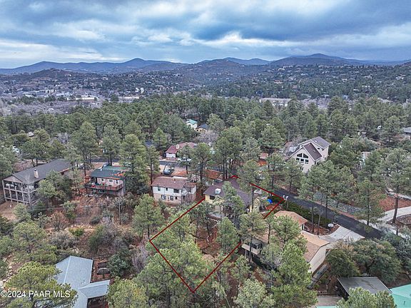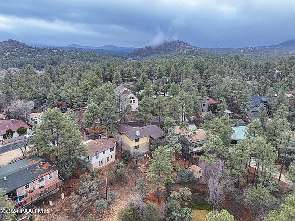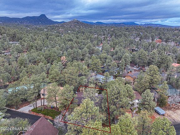 Beautiful views from this gem in the historic and highly sought after, Hassayampa Mountain Club neighborhood. Surrounded by pines, but only minutes from the Courthouse Square/Whiskey Row and close to all the amenities that Prescott offers. Elegant hardwood floors. Large great room with a wood burning stove for cozy nights. Enjoy morning coffee or starry evenings on the first covered deck. Walkout basement with huge living space also has a covered deck that opens to a fenced, low maintenance backyard in the pines. Hobby shed has power. Two car garage with extra parking pad. No HOA!