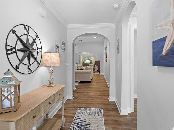 A charming 4 bedroom 2 bath home located in a quiet well established community with sidewalks and quarter acre lots. Just five miles to the beach and close to all the shopping, entertainment & restaurants, it makes this location hard to beat. This home will welcome you with a covered front porch and a large enough driveway to fit four cars plus your own mail box conveniently located on your property. As you enter the home you will immediately notice luxury vinyl plank flooring. To the right you will find two bedrooms and a full bathroom. On your left, a stairway to go up to the fourth bedroom or bonus space which can be used for whatever your needs may be. Walking into the main living space you will find an open floor plan, a breakfast bar and eat in kitchen. Plenty of cabinets, counter space and a walk in pantry. The dining room is its own separate space and can be used as dining room or for something else. It is currently being used as a music room. There is a covered screened in back porch off the kitchen to enjoy the beautiful SC weather and private tree lined lot. The living is room a bright and spacious area to entertain and has a fire place to stay warm on chilly nights, a perfect spot to relax. The expansive owner's suite is a luxurious retreat offering plenty of space to unwind. The en suite bathroom features separate glass-enclosed shower and separate soaking tub. Dual sinks and vanity provides ample room for two. A massive walk in closet completes the suite, offering abundant storage and organization options. Book your showing today!!
