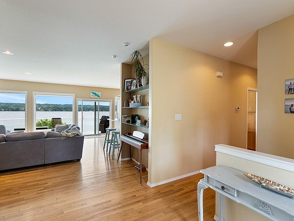 This stunning 5-bed, 3-bath home boasts over 3,600 sq ft of beautifully finished living space, thoughtfully designed to showcase sweeping ocean views from both levels. With walk-on beach access and a gently sloped driveway reaching the high tide line, launching a kayak or heading out for a shoreline stroll is effortless. From the moment you enter, the vistas steal the show. The bright, open-concept main floor features expansive windows, a propane fireplace, and easy flow to the oceanfront deck. The kitchen is built for entertaining, offering a large island, prep sink, raised eating bar, and convenient roll-out shelving. The private primary suite sits in the south wing, while two additional bedrooms and a full bath occupy the opposite side. The walk-out lower level adds two bedrooms, a full bath, office, & a generous rec room, ideal for guests, media, or hobbies. Outdoors, enjoy the beautifully landscaped yard with a gazebo, and unwind in the hot tub while soaking in the coastal views.