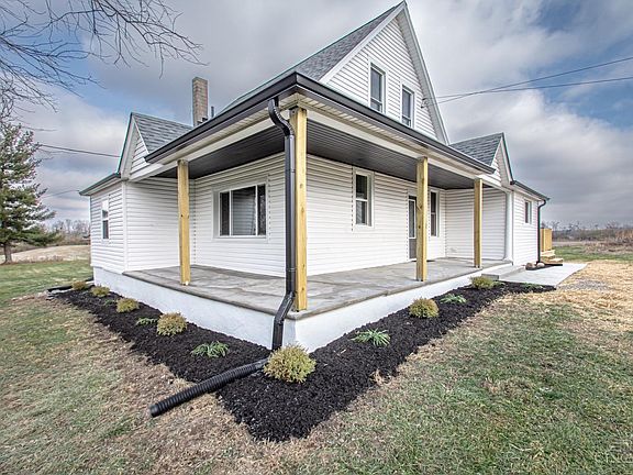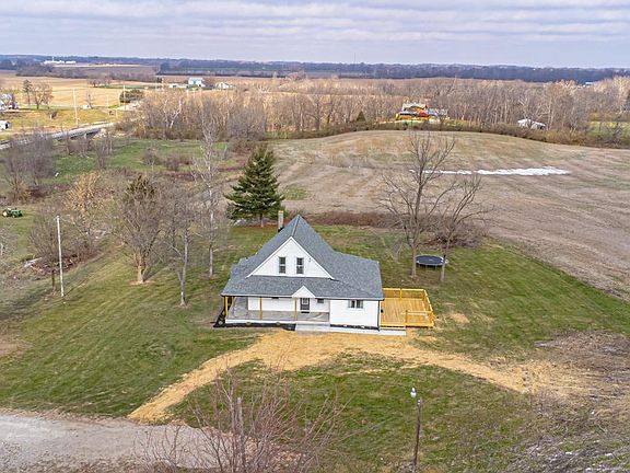 Nestled on 2 acres of farmland, this fully remodeled 4-bedroom, 1-bath farmhouse blends modern updates with rustic charm. Refinished original hardwood floors take center stage, with matching flooring added to the bright Living Room, which opens to a new deck overlooking the countryside. A wrap-around porch adds to the outdoor appeal. The gorgeous kitchen features butcher block counters, stylish fixtures, and a large picture window, perfect for gazing while enjoying your morning coffee. The fully remodeled bathroom includes laundry access. Two spacious main-floor bedrooms offer ample closets, while upstairs features 2 bedrooms, one of which is accessible through the other, also, ideal as a sitting or dressing room. Fresh paint, new carpet, and thoughtful finishes make this home move-in ready. NOTE: The barn on the neighboring property is scheduled for demolition in the new year. Property lines are marked with red stakes.