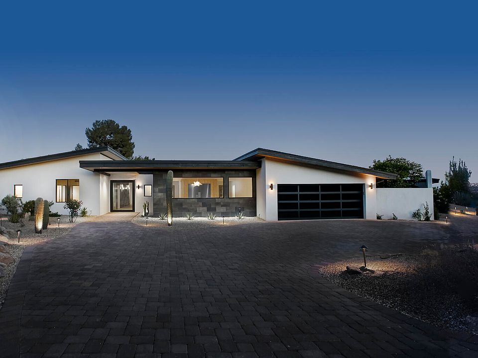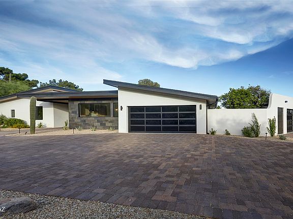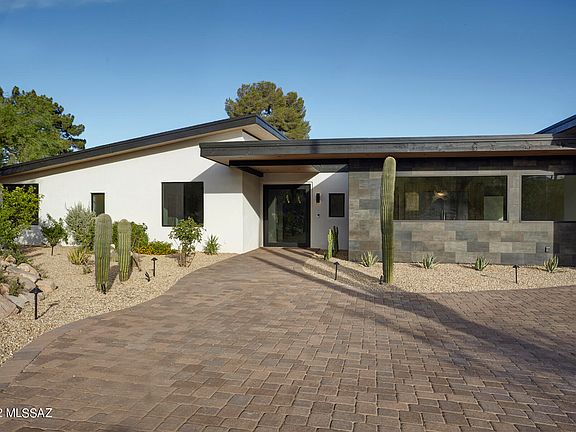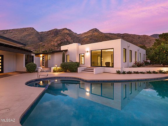 Incredible Architecturally re-defined and re-designed Mid-Century Modern Home and Guest house combines timeless design with 21 century smart technology. This elegant home includes two kitchens with Sub-Zero and Miele appliances with custom cabinets, granite and porcelain countertops and panoramic mountain views. The living area encompasses a formal dining and living area, a powder room and informal living area with wine display and endless city views and a multi-purpose room which could be a home office, den or workout room. Three large en-suite bedrooms with mountain or golf course views complete the main house. The spacious primary bedroom offers quite solitude from the private patio and the primary bath has a sleek Asian influenced design with floating cabinets with porcelain countertops, two closets and floor to ceiling titles surround the Japanese round soaking tub and walk-in shower and Toto toilet/bidet. The informal living room leads to the diving pool, spa and guest house with a dramatic outdoor space with mountain, city and golf course views setting the stage for a private oasis. The Main garage has a built-in cabinet and a workshop. The second garage has double doors on each side allowing for a breezeway to backyard. The guest house has its own private patio, a kitchenette ready and three fourth baths and an unparalleled view of downtown Tucson and A mountain. This beautiful hillside home in Skyline Country Club is ready to create a lifetime of memories for generations to come.