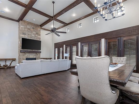 MUST SEE!!!Luxury living in the exclusive Edinborough Pointe located in Edmond school district. ENORMOUS open living room with VAULTED BEAMED CEILINGS & QUARTZ fireplace. Spectacular NATURAL LIGHT spreads across the room through 5 sets of oversized FRENCH GLASS DOORS with WOOD PLANTATION SHUTTERS! Open floor plan with formal dining & breakfast room, lead to a CHEF'S KITCHEN with built-in refrigerator, DOUBLE OVENS, 6 BURNER GAS RANGE & large butler’s pantry. Primary bedroom has a door to a PRIVATE PORTICO! Primary's spa like bathroom has HEATED FLOORS & 8 HEAD STEAM SHOWER! One secondary room is across the hall with private bath. Study, mudroom & large laundry room are downstairs. Floors have WOOD TILE and new carpet! On the 2nd floor is a large MEDIA ROOM, 3 bedrooms & 2 bathrooms. Outdoor living space has LARGE KITCHEN GRILL, EXTENSIVE PORCH, GREEN TURF with wooden playset, PUTTING GREEN, AEROBIC SYSTEM, & DOG RUN! The 3rd garage has its own AC & can flex as workout room!