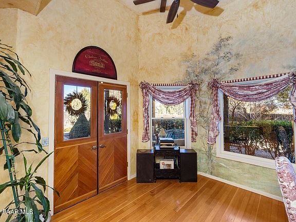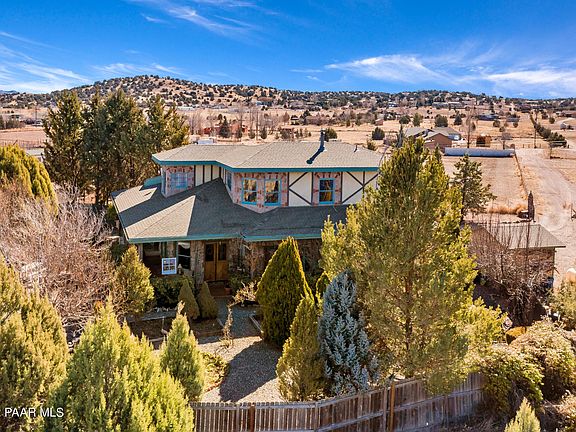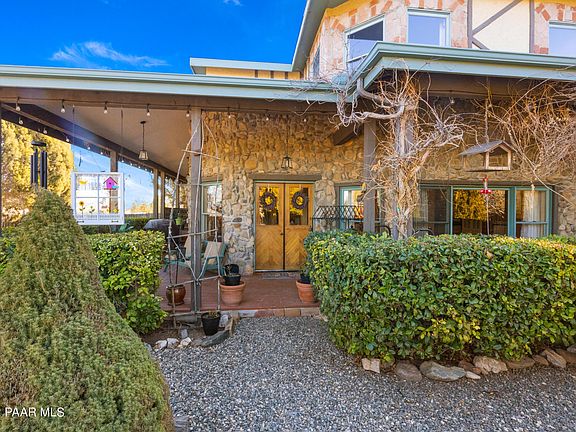 Truly charming cottage-chic home on sprawling 7 acres in Chino Valley. This one-of-a-kind cottage is reminiscent of Fiddler on the Roof with touches of European style rock and wood throughout the home. Personal touches all over show true pride and craftsmanship with tile and gates imported from England and artistic and whimsical hand painted murals. The kitchen boasts of hand-crafted Sugar-Pine cabinets, flagstone floors and Jenn-Air gas range. Formal and informal dining plus an Arizona room to enjoy coffee while admiring the greenery of the garden. The 3rd bedroom or sitting room/den off the master bedroom create a story-book cozy feeling yet are separated for privacy. Million-dollar views and a private garden sanctuary surround the home with a quaint wrap-around porch