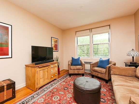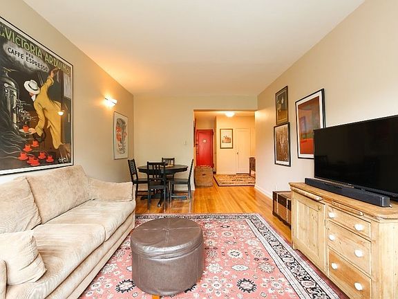 Move right into this meticulously maintained, true two bedroom corner unit with lush views of Owls Head Park and seasonal views of the Narrows. The spacious living area comfortably accommodates a dining table. There are lovely hardwood floors throughout, an airy open flow with windows in each room and plentiful closet space. Both bedrooms are very generously sized. Enjoy your morning coffee in the modern eat-in kitchen overlooking the tranquil park gardens. The kitchen is gracefully enriched with cherry wood cabinets, stainless appliances and quartz countertops. The immaculate neutral styled bath has also been redone. This building is a favorite for many reasons, including its excellent financials and incredibly low maintenance of $797 INCLUDING ALL UTILITIES! Amenities include a recently updated card operated laundry room, storage/ bicycle rooms for a nominal annual fee and waitlist for Garage, but easy interim street parking. This coop is 100% owner-occupied (no subletting) and pets are welcome with board approval. This is one of the hottest locations in Bay Ridge due to the ultraconvenient access to the NYC Ferry, WITH SOON TO COME 20 MINUTE EXPRESS SERVICE TO WALL STREET, NYC 27/37X Express Buses and local buses to the R train only a block away and close entry to the BQE and Belt Parkway. You will enjoy the advantage of the nearby Waterfront Promenade, bicycle path, 69th Street Pier, park & dog run, Narrows Botanical Gardens and the many other beautiful outdoor spaces ideal for picnics and strolls. And last, but not least, you will delight in Bay Ridge's acclaimed restaurants and fantastic shopping!