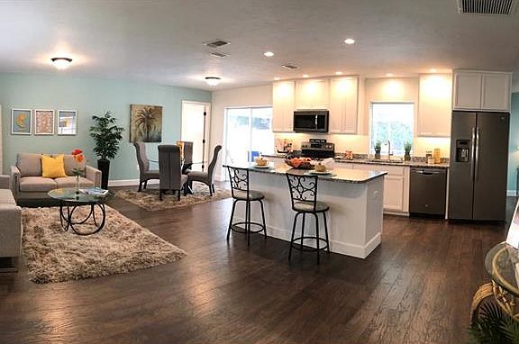 Newly renovated and ready to WOW! at every turn, we are very pleased to present this modern West Bradenton home for immediate sale. You'll notice chic design elements throughout, including the open concept living areas, hand-sawn flooring, single-bowl kitchen sink, Slate appliances, floating bath vanities, Roman entry shower and dashing Sherwin Williams color palette. Behind the trend-setting design you'll discover this home boasts desirable functionality; All 3 bedrooms offer their own walk-in closet, there is an ideally located large kitchen pantry and 2 additional hall and bath closets, offering storage solutions to handle most needs. Additionally, the bedrooms are split, with the master on the East and the remaining on the West, and the pool and large lanai face south, to maximize the suns' rays. A new roof, a new A/C, an extensive irrigation system, new sod with tropical landscaping and transferrable warranties on appliances, roof, flooring and granite round out this lovable home. Come see it today!