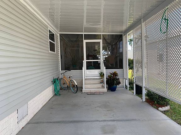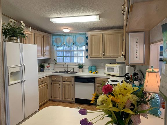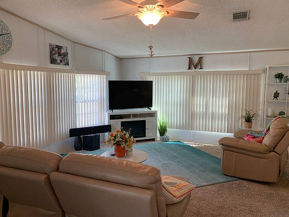 This is a mobile home for sale in a 55+ community on a rented/leased lot. MOTIVATED SELLER! Will review ALL offers. This 2BR/2BA home has vaulted ceilings with a side set screened in lanai. The floor plan opens from the living room through the dining room to the kitchen. There is newer carpet in the living/dining area, vaulted, textured ceilings, a ceiling van and vertical blinds. It is bright and airy with many windows. There is laminate floor and a breakfast bar in the kitchen. There are plenty of cabinets and counter space. All appliances are included: Refrigerator, stove, built-in microwave, dishwasher plus the indoor washer and dryer in the closet in the side hall entrance off the lanai. There is also a convenient desk/office area in the same hall. This home has a master bedroom with newer carpet, 2 closets and a master bath en suite. The master bathroom has laminate flooring, vaulted ceilings, a single sink vanity, walk-in shower and a soaker tub. The second bedroom has newer carpet, a ceiling fan and a closet. The hall bath is a tub/shower combination with a single sink vanity and laminate flooring. The screened lanai is on the carport. The carport can house 2 cars tandem style. There is a shed on the back for extra storage. The lot rent is $754 and lawn cutting, edging and blowing along with the amenities as outlined below. Ridgewood Estates is a well maintained GATED community with 2 heated pools, a hot tub, shuffle board & tennis courts, horseshoe pit, pool side club house with a library, fitness center & billiards room. There is also a large "event" center used for many HOA sponsored events. Cards, Bingo, Chair Volleyball, water aerobics....just to name a few :-)