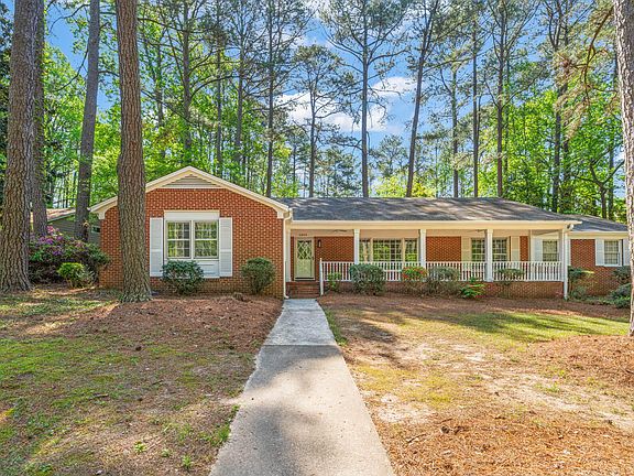 Step into opportunity with this solidly built charming 3-bedroom all-brick ranch nestled on a spacious, beautifully landscaped lot filled with vibrant flowering plants. This well-maintained home offers formal living and dining rooms, a generously sized family room with a cozy masonry fireplace, custom built-ins, and direct access to a vaulted sun room—perfect for enjoying natural light year-round. The cook-friendly kitchen is designed for convenience, featuring ample counter space, dishwasher and trash compactor for easy entertaining. Relax on the expansive 40x8 covered front porch or enjoy the backyard oasis. Additional highlights include an attached garage with heated/cooled office area, a detached carport with ramp access to the sun room, and a detached storage building with electricity. Hardwood floors under carpet in all bedrooms. Tucked in a quiet, established neighborhood in prime North Raleigh, just minutes to shopping, dining, I-540, and excellent schools. A rare gem with space, charm, and location! This home has great bones and is just waiting for your personal touch!