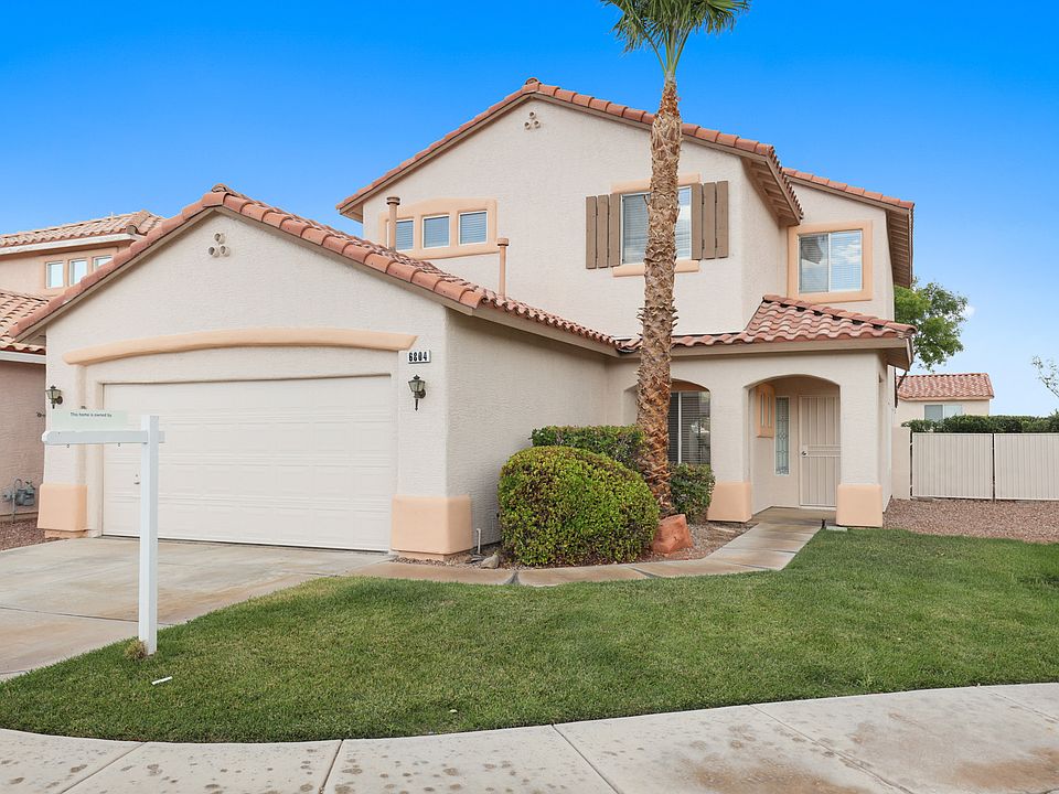 Wonderful 2-story home located n the Elkhorn- Cimarron Estate community at Centennial Hills. This home features 4 bedrooms, 1 den, 3 bathrooms, 2-car garage with 2,203 square feet of living space. Welcoming large living room upon entry is joined with formal dining and den. Lovely arched doorway and pony wall separates the kitchen and the family rooms in the rear. Family room has bright ambiance with lots of custom windows, cozy fireplace, media niche and is open to the kitchen. Kitchen boasts tile countertops, plenty of cabinets and is well appointed with eat-in dining. All bedrooms are upstairs. Master bedroom is airy and comfortable with vaulted ceiling, sitting area and walk-in closet. Master bathroom has dual sinks, deep roman tub, and walk-in shower. Backyard is professionally landscaped with covered patio, lawn and RV gate. This neighborhood has great location nearby parks, restaurants, and easy freeway access. Contact us NOW for further details and viewing appointments.