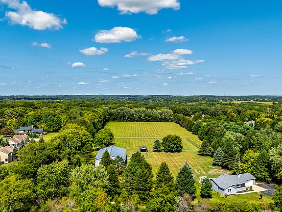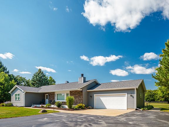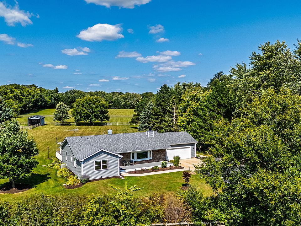Welcome to a property unlike any other! This extraordinary 5-acre estate on a private drive offers the ultimate in modern country living. With a fully updated ranch home and an incredible 54x90 pole barn, this is more than just a home-it's a lifestyle. Imagine a place where you can ride horses, entertain guests, and enjoy the peace and quiet of your own secluded sanctuary. Step inside this beautifully renovated ranch home, where every detail has been thoughtfully updated. In 2022, the siding, windows, gutters, and roof were all replaced, giving you peace of mind for years to come. The heart of the home is the stunning kitchen, featuring a farmhouse sink, pristine white cabinetry, granite countertops, and top-of-the-line Samsung smart stainless-steel appliances. A huge island with a breakfast bar provides the perfect spot for casual meals and gatherings. The living room, complete with an inviting natural fireplace, is filled with light from a large picture window. All closets feature custom California Closet systems, ensuring excellent organization. The primary suite offers double closets and a private full bathroom with a stand-up shower, while the main bathroom includes a luxurious whirlpool tub and a lighted makeup mirror. A consistent white trim package throughout the home creates a fresh, modern feel. This property is a horse lover's dream. The massive pole barn includes a concrete pad, 100-amp electric service, two horse stalls (with room for two more), a tack room, and three water hydrants. A fenced pasture with a mud paddock and a lean-to provides everything needed for your animals. Enjoy the outdoors from your front porch or entertain on the back deck with its beautiful pergola and an adjacent concrete patio. The 2.5-car heated garage and long, private driveway provide ample space for all your vehicles and equipment. The finished basement adds incredible value and space to this home. It includes a large rec room with a pool table included a bar area ready for a wet bar, and a utility room. There's also a potential fourth bedroom with an egress window, a full bathroom, and a huge laundry room with plenty of storage. The house is built with 2x6 exterior walls and R30 insulation and features a whole-house water filtration system, a reverse osmosis drinking water system in the kitchen, an owned Culligan water softener (3 years old and serviced every year), and a new pressure tank (1 year old). This is a rare opportunity to own a meticulously cared-for home with extraordinary land and amenities. Adjacent 5.05 acres also for sale! Purchase both and control your privacy and increase your horse/animal possibilities!