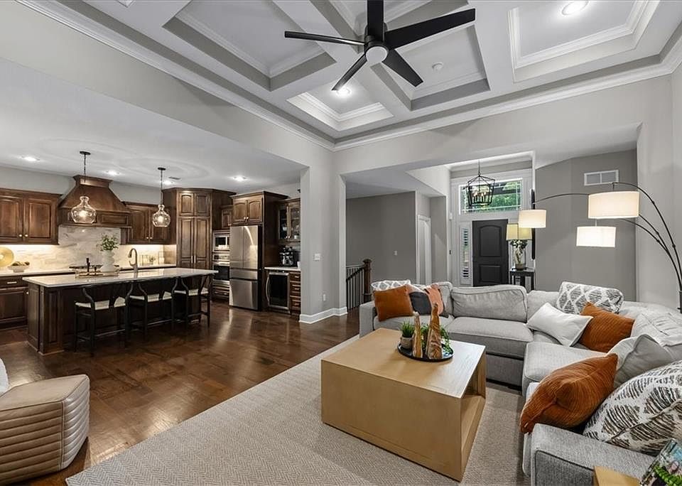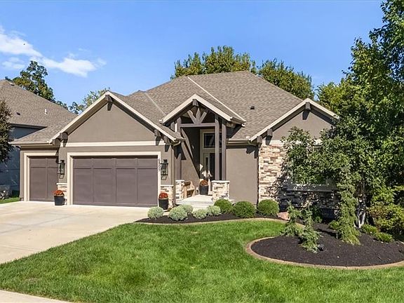 Welcome to comfortable living in this lightly lived-in former model home (Rodrock - Dillon reverse), perfectly positioned on a private wooded walk-out lot. The open floor plan draws you in with gleaming hardwoods, a beamed great room ceiling, and a cozy two-sided fireplace for gatherings. A chef’s kitchen awaits with quartz countertops, stained cabinetry, stainless steel appliances, and an oversized walk-in pantry. The main level bedroom doubles beautifully as a guest suite or home office. Retreat to the primary suite with tranquil backyard views, spa-like bath with whirlpool tub, separate shower, dual vanities, and a walk-in closet connected to the laundry room. Entertain with ease in the expansive lower level boasting a wet bar, family room, and two private ensuite bedrooms. Outdoor living shines with a covered deck and see-through fireplace plus a covered patio overlooking serene trees and wildlife. Recent updates include fresh interior and exterior paint, plantation shutters throughout, new quartz kitchen counters, kitchen backsplash, lighting, deck extension, landscaping, and more. Nestled in a secluded hilltop neighborhood with no neighbors behind, this home combines privacy with convenience. All just minutes from Shawnee Mission Parkway shopping and eateries in the award-winning DeSoto School District and Mill Valley High School attendance area—this one is ready to impress and ready for you!