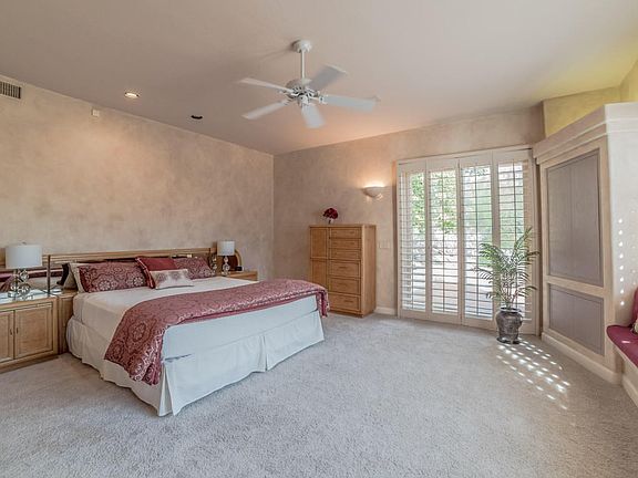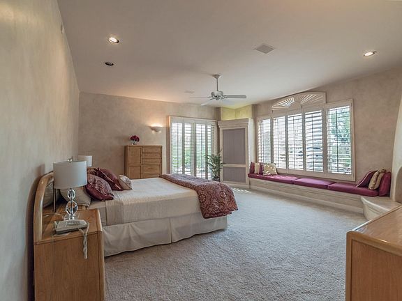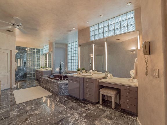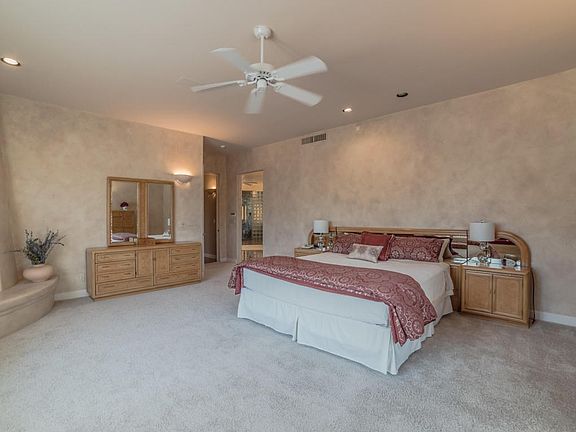 Serene and elegant Mediterranean with absolutely stunning city and mountain views overlooking the 11th fairway in prestigious Skyline CC Estates. You will be in awe over the lovely bridge over a wash leading from the circular drive to the beautifully landscaped yard w/fountain, the custom leaded glass/carved wood entry door, formal foyer with soaring ceilings & dramatic dual sided stone fireplace. Numerous french doors, crown molding, hardwood floors and custom shutters throughout. Gourmet kitchen w/ custom cab's, granite, built-in frig, wine cooler & wine rack. Master suite w/ FP, dual vanities,Jacuzzi tub, marble tile, & huge walk-in closet. Beautiful resort style custom built pool/spa, covered patio, brick pavers, Island w/gas grill, prof. landscaped w/low care desert foliage and cacti.