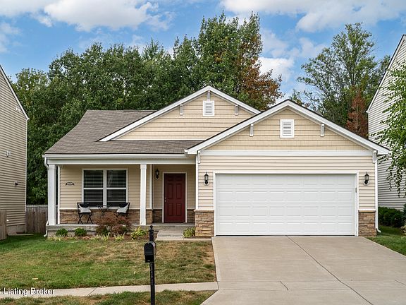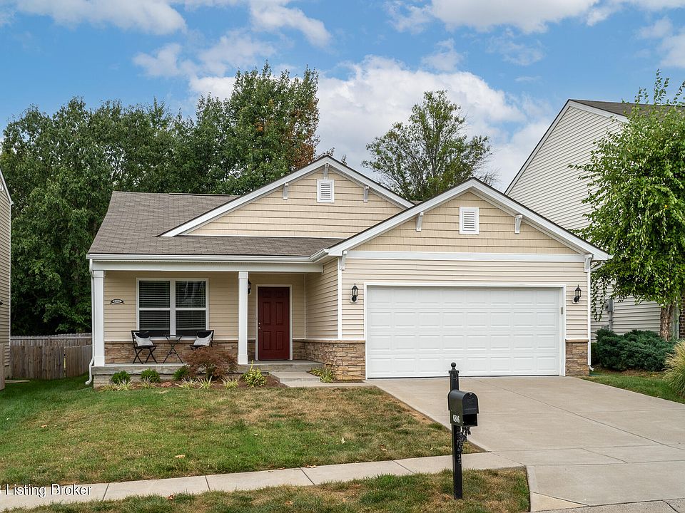 Welcome to this beautiful 3-year-old ranch home in the desirable Hanover Trace neighborhood of Louisville, Kentucky. With a modern design and upgraded features, this home offers the perfect blend of comfort and functionality. Upon entering, you'll be delighted by the spacious open floor plan, creating a welcoming and airy atmosphere. The kitchen, living, and dining areas seamlessly flow together, providing a perfect space for relaxation and entertaining. With three bedrooms plus a bonus room, there is plenty of space for you and your loved ones to spread out and personalize. The two full bathrooms ensure convenience and comfort for all. Closet space is abundant throughout the home, ensuring ample room for your wardrobe essentials and storage needs. All new appliances, mechanicals, and roof contribute to the peace of mind that comes from purchasing a nearly new construction home. Additionally, the added blown-in insulation provides energy efficiency and improved comfort. The two-car garage is not only equipped with epoxy flooring for durability, but also features additional custom storage, allowing you to keep your belongings organized and easily accessible. This property comes complete with a washer and dryer, making moving in a breeze. Relax and enjoy the neighborhood atmosphere from the inviting front porch or unwind on the nice back deck, offering space for outdoor lounging and dining.