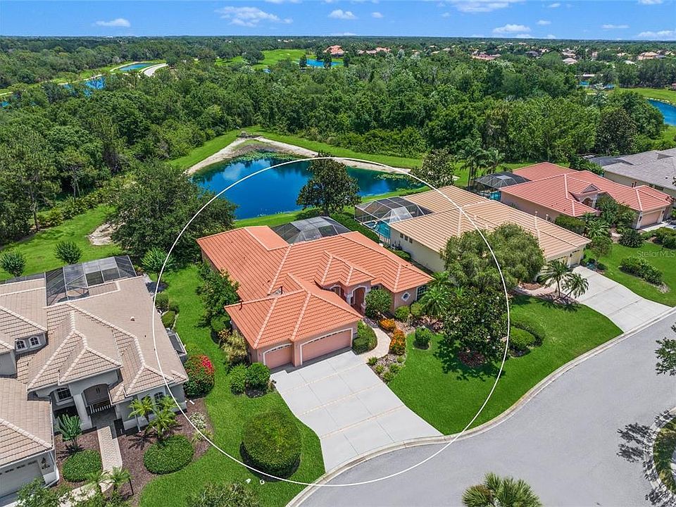 Enjoy the privacy and serenity of this lakefront four-bedroom home by Lee Wetherington in Riverwalk with a scenic water view and a tranquil nature preserve beyond. Ideally located at the end of a quiet cul-de-sac, this home is the epitome of all things Lakewood Ranch - situated in one of the town’s first communities and known for its central location, wider lots, and low HOA fees. This idyllic setting is complimented by a spacious, open, and bright interior with a thoughtful indoor/outdoor flow and formal living and dining rooms, family room, and a separate den with built-ins. Wood floors, high ceilings, arched openings, and crown moldings set the stage for day-to-day living and entertaining. A chef’s kitchen with stainless steel appliances, granite countertops, and a breakfast bar opens to the eat-in area and large family room w/spectacular views of the water and preserve. The indoor/outdoor connection extends the main living areas onto the spacious screened lanai with two separate covered areas perfect for both dining and lounging - and a refreshing pool. The primary suite also opens to the pool terrace and has walk-in closets and a spa-like bath with a garden tub, dual sinks, walk-in shower, and built-in vanity. Three additional bedrooms provide space for everyone. In this one-of-a-kind setting, the pool and terrace feel makes you feel one with nature with views towards the water and preserve - a constant breath of fresh air and peace. Completing the picture, you’ll love the convenience of a three-car garage and a laundry room with built-in cabinets and a utility sink. The interior has been freshly painted, with new carpet installed in the bedrooms. Situated in the heart of Lakewood Ranch, the #1 multi-generational community in the United States, Riverwalk is conveniently located just minutes to Lakewood Ranch Main Street, championship golf courses, UTC Mall, Waterside Place, top-rated schools, award-winning medical facilities and more. Nearby I-75 brings you to Bradenton and Sarasota, where arts and culture, shopping, dining and world-renowned beaches are beckoning.