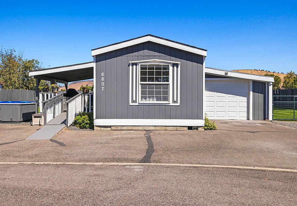 This manufactured home was recently remodeled with many nice upgrades. This is a single wide manufactured home on its own double parcel. The home has 938 sq ft but has an enclosed garage, covered deck and a spa on the landscaped double lot. Owner reports great neighborhood and the property is comfortable and easy to maintain. Newer 30-year roof and the home is a Crown Point by Fleetwood. Many spaces for parking and the association includes two RV parking spaces in the storage area. This home has a 1 year First American Home Warranty which will transfer to the new owner.