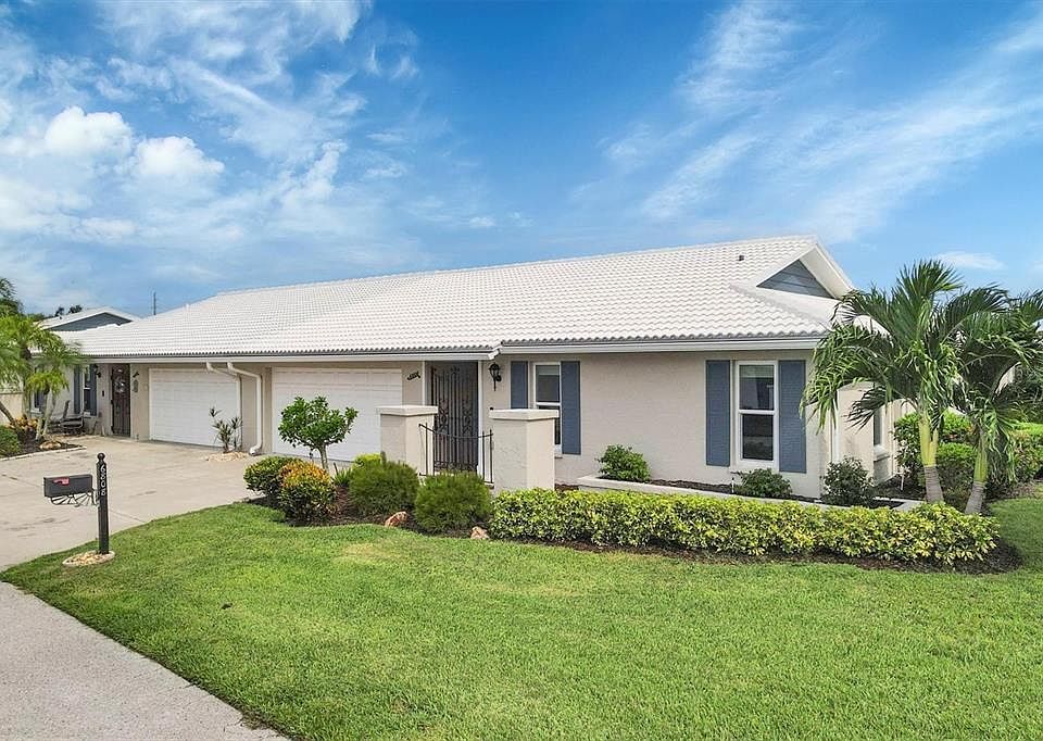 Embrace the Florida lifestyle with this ever-popular 55+ Village Green paired villa on a quiet cul-de-sac and located in far west Bradenton only 5.7 miles to beautiful Holmes Beach on Anna Maria Island. This most popular D model floor plan offers 1803 sq ft of air-conditioned space and includes an exterior 16 x 14 screened paver deck area overlooking a greenbelt, suitable for relaxation and entertaining. This outdoor patio area is referred to as “the bird cage.” This floor plan comes with an oversized 2 car garage with a wind resistant door on remote. As a bonus, tile roof replaced in 2018, A/C and electric service panel new in 2022, all at the owner's expense. For safety reasons hurricane impact wind resistant insulated windows protect the interior. Upon entry, the unit features a secure steel gate and a roll-down hurricane shutter. A ceramic tiled foyer with two large closets, new carpet in the bedrooms, dining room and living room all having crown molding and upgraded window treatments. Double pane insulated French doors open to the Florida room and also access the outside birdcage from the family room. The galley kitchen features a serving pass through to the dining room, granite counter tops, a stainless-steel double sink, refaced cabinets with draw and pantry pull outs, recessed lighting, a new garbage disposal 2022 and a new dishwasher at the end of 2024. Both bedrooms are spacious and include large closets. The primary bedroom suite offers a spacious walk-in shower. Both bathrooms partially updated. The laundry room includes a full-size washer and dryer, a utility sink, overhead cabinets for storage, and extra space that can be used for additional appliances or repurposed as a craft area or office. The land owned condo fee only $350 a month and paid $1,050 quarterly covers basic cable TV, internet, exterior painting, annual roof cleaning, common area taxes, community pool, escrow reserves, grounds maintenance, landscaping (excluding the patio area behind the front pillars), exterior pest control, and pool upkeep. This location provides quick access to shopping centers, medical facilities, unlimited restaurants, GT Bray Park, Robinsons Preserve, Downtown Riverwalk, and the Gulf Beaches. The nearest airports are SRQ, TPA and PIE. For your own personal private showing secure your appointment with the listing agent today.