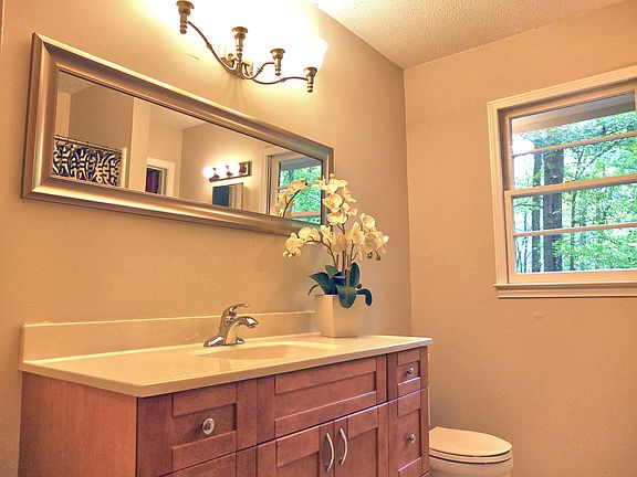 1.4Acres Close to highways and shopping. Live in the woods and be just a shortdrive to major roads and shopping. Some upgrades and improvements, interior freshly painted, carpets cleaned and new kitchen and dinning flooring. Full basement, partially finished for your own personal media room or man cave. Vented for a woodstove. Lots of possibilities forcustom space and a private patio . You will love entertaining on the 600+ SF deck.