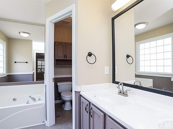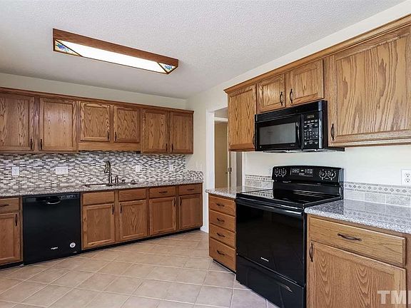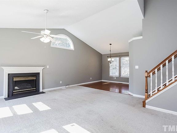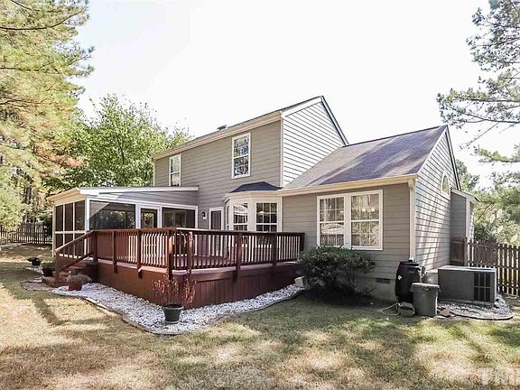 This Raleigh cul-de-sac home offers hardwood flooring, a tankless water heater, a fireplace, granite kitchen countertops, a master bath separate tub and shower, a master bedroom walk-in closet, an enclosed patio, a deck, and a two-car garage.