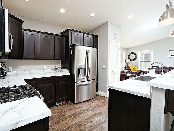 Newer fully finished home conveintely situated across from a large beautiful park! Beautiful open layout with vaulted ceilings, gas fireplace, spacious kitchen island with breakfast bar, pantry & stainless steel appliances. There are 2 bedrooms on the main level, including a master suite with dual sinks and walk-in closet. The large family room in the basement offers enough space for a game area plus a separate theater area. The basement also hosts 2 additional egress bedrooms & full bathroom. Enjoy a cup of coffee on the front porch and entertain on the covered back patio in your fenced and landscaped yard. This gorgeous home is complete with a 3 car garage plus RV parking!