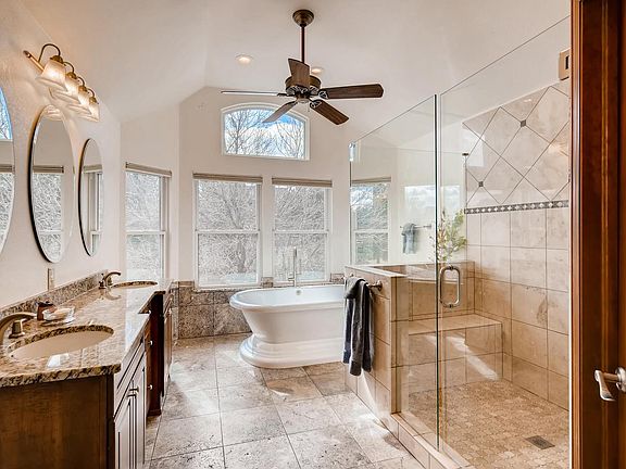 Gorgeous home with stunning views !! Sunny, happy home with brand new high quality flooring throughout main level, a nice open kitchen to cook and chat with a gas cooktop in island, beautiful granite, stainless appliances. Lots of natural light through nice tall ceilings and lots of windows, large family room, with fun dramatic brick fireplace and plantation shutters and it opens to the deck with those great views. There is a butler pantry for ease of entertaining next to the dining room, and don't miss the main floor study. Living room is now used for a play room but your furniture will fit nicely. Spacious Master Bedroom with big windows, gorgeous bathroom w/ great tub, and walk in closet. All bathrooms have been updated and bedrooms are good size. Super walk-out basement features additional living space, wet-bar and bathroom with steam shower. Huge backyard, desirable area with trails and pool, great school choices. Photos don't show views or do this home justice. Quick Move In!!