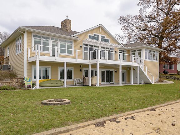 Lake Living on Wonderful Lee Lake - Absolutely gorgeous custom built ranch style home with 110' of sandy beach front. Spectacular lake views from every room in the house. The main floor boasts an open floor plan with great room and vaulted ceilings, stone accent gas log fireplace in living room, beautiful kitchen with Cambria countertops, 4-seasons room and an office/den. Also, on the main floor is the spacious master suite with spa like en-suite bathroom and main floor laundry. The lower level features 2 bedrooms - both with wonderful views of the lake, family room with another gas-log fireplace and kitchenette. Composite wood deck has unobstructed views of the lake with wire railings and the lower level patio is wonderful for entertaining. Picture yourself enjoying playful days on the lake and watching the unbelievable sunsets at the end of each day.