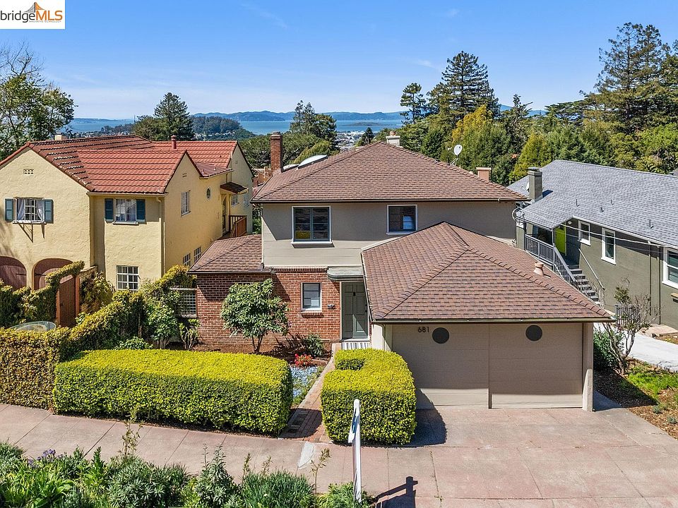681 Coventry is a classic Kensington home set just enough up the hill to offer both breathtaking Bay views and convenient accessibility to upper Kensington Markets, Colusa Circle, El Cerrito and North Berkeley shops. Upon entering through the charming private garden, you are greeted with a grand living and dining room inlaid with richly colored, exposed wood beams and large picture windows overlooking the lovely garden and Bay. The home balances elements of Spanish-inspired architecture with newly upgraded kitchen and bathrooms including radiant heated floors. The home features a fantastic layout: 3 bedrooms and a bathroom on the upper level, 1 bedroom and a half bathroom on the entry level, and a large finished lower level with interior and exterior entrances, a large family room, kitchenette and a full bathroom with the potential to create an in-law suite or ADU. The massive primary bedroom includes a sitting room ideal for enjoying sunsets over the Bay, or it could be a place to add a primary bathroom suite. Equally as impressive is the home is the deep lot filled with flat lawn spaces, winding paths, mature plants. The gardens have been cared for with great attention to detail by its owner for the past five decades, and have been featured on the Berkeley Garden tour.