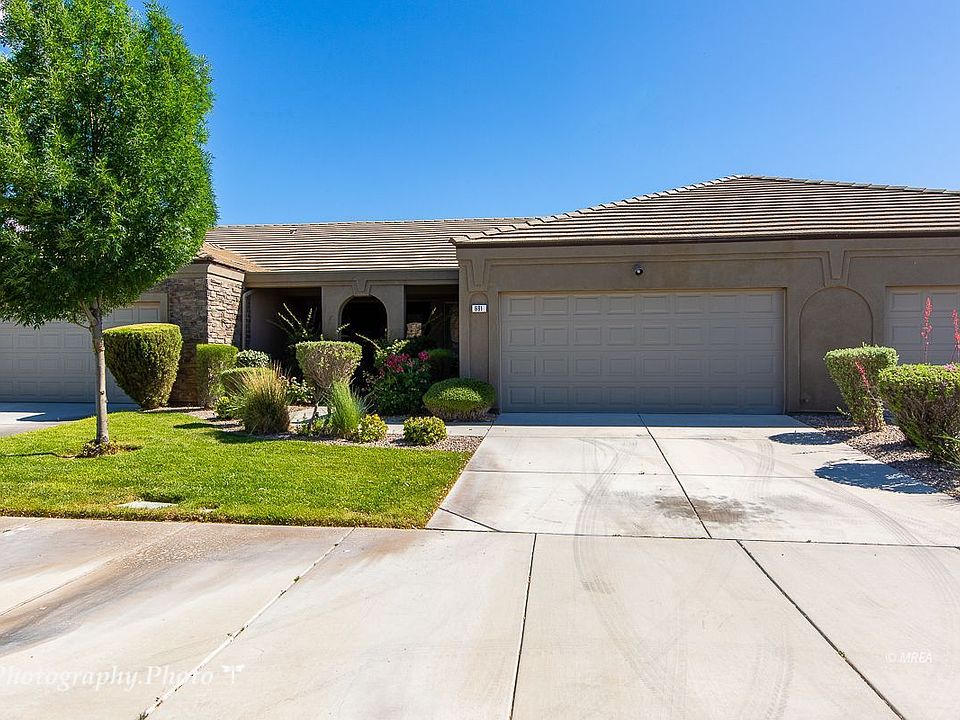 Town home with Golf Course and Mountain Views! It features views of the beautiful Virgin Mountains to the south. Full length patio on the back. Large, covered entryway in front. This well cared for town home is just a very short walk to the pool & hot tub. Tile floors in living areas, carpet in bedrooms. Alder cabinets and wood shutters. Beautiful plants, trees, shrubs and grass are cared for by the HOA making living in this area a totally carefree experience!!!