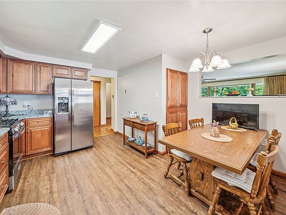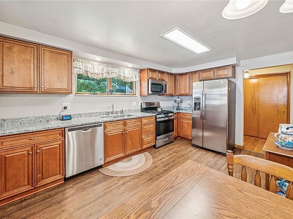 This charming brick ranch sits on a peaceful 1.65 acre lot at the end of a quiet street, offering both tranquility and convenience to local parks and amenities! The inviting curb appeal greets you and leads you to the warm and spacious, updated eat-in kitchen, with plenty of cabinetry, modern stainless steel appliances, and granite countertops! You will love the first floor living area with gleaming hard wood floors, and a large picture window letting in tons of natural light. The pass through between the kitchen and living room provides character and ease for entertaining! On the lower level, the spacious family room features a wood burning fireplace, kitchenette, full bathroom, and third bedroom, making it a potential space for multi-generational living! You'll also find a workshop or great storage space, you decide! The covered side porch would be nice for grilling or enjoying a coffee! This home has been loved and maintained and is ready for you to make it your own!