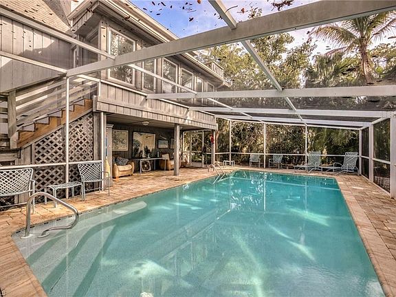 Your Sanibel dream lifestyle awaits you in this charming, fully furnished, turn key home a short walk or bike ride to prestigious West Gulf Drive and the beautiful Gulf beaches of Sanibel Island. The water views of the Sanibel river, which overlooks a preserve with walking and bike trails, are spectacular from every room in the house. Spacious and updated eat-in kitchen with granite counter tops and all stainless appliances. Large open floor plan with wood and tile flooring, a stone fireplace, and cathedral ceiling welcomes you on the main living level. Three spacious bedrooms with water and nature preserve views are upstairs on the top floor. Rare to find a home in this neighborhood that includes a large and very private screen enclosed pool with brick-pavers surrounded by a naturally landscaped back yard and property. Possible apartment and/or mother-in-law suite on the first floor. Private deeded beach access on West Gulf Drive is included with this residence.