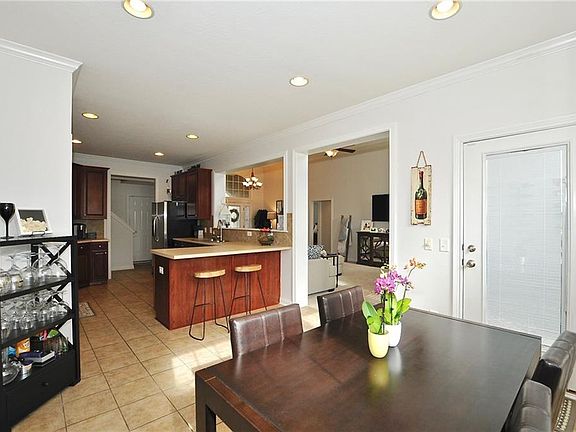 Contemporary with dramatic 12' ceilings, split bedrooms and former custom builder's personal home. GR has floor-to-ceiling masonry fireplace and crown molding! Kitchen features 42" cabinets, ceramic tile and newer stainless appliances. Master suite has double tray ceiling, jetted tub and separate shower. Upper level is a great retreat, pool room or video game area. Backyard is tree-lined and private, and features a complete fenced back yard.