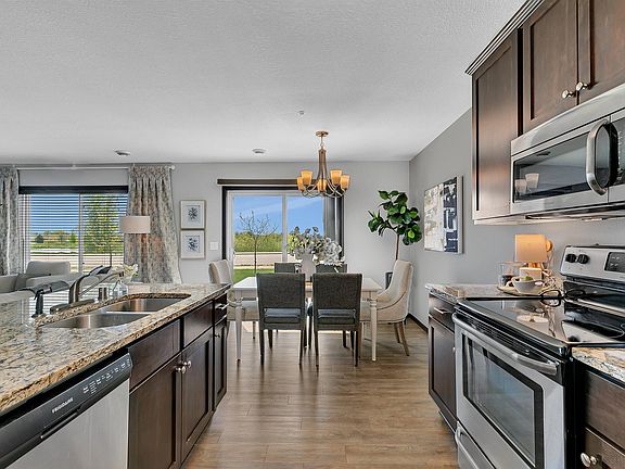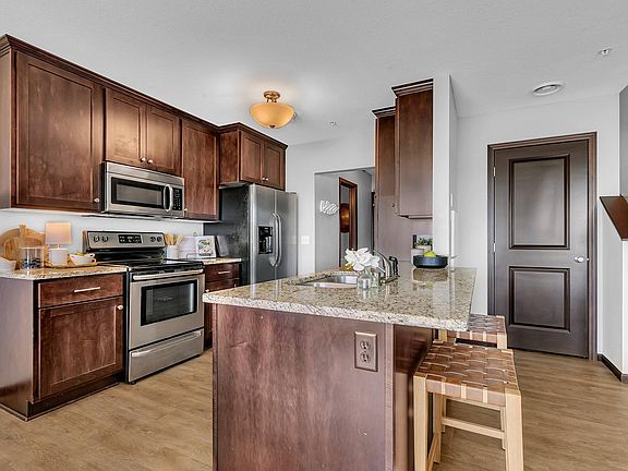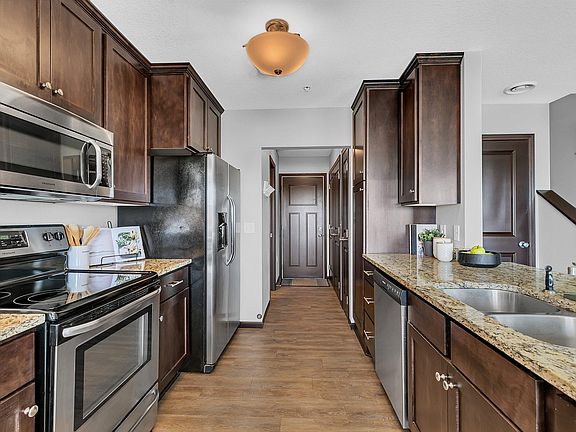 Greystone at Heritage Place offers luxury townhomes in the Sartell School District. The upper level offers 3 bedrooms including the large primary suite with private bath and walk in closet. There is a full common upper level bath and an upper level laundry room as well. The main floor has an open kitchen/dining/living room area, luxury vinyl plank flooring, a half bath, dark stained maple cabinets with granite counter tops, stainless steel appliances, and a rear patio.