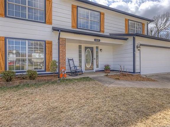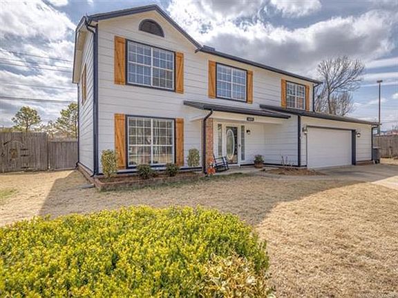 This lovely 3 bedroom, 2.5 bathroom home has a large yard and sits in a cul de sac! It has 2 living spaces (1 with a fireplace), a dining room, and an open kitchen. The bathrooms have been updated and the Master closet was custom done and is HUGE and AMAZING! The farmhouse exterior was recently completed and adds lots of charm to this South Tulsa gem.