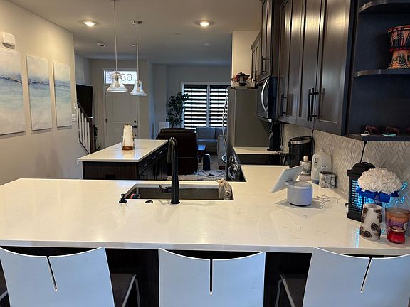Island kitchen with designer Quartz countertops, pendant lights, and upgraded cabinetry with convenience features